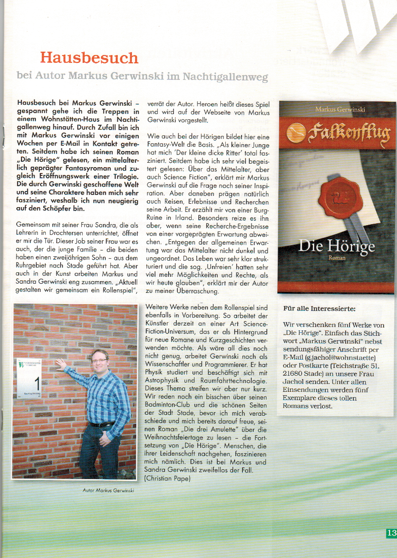 Die Wohnstätte Stade hat in der jüngsten Ausgabe ihrer Genossenschaftszeitung, dem Wohnstätten-Kurier, einen Artikel über meine Autorentätigkeit veröffentlicht. Er schließt mit einem Gewinnspiel: Zu gewinnen gibt es 5 Exemplare von Falkenflug 1: Die Hörige.